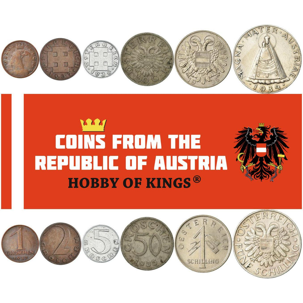 Baksidestext: 1 Groschen 1925, 2 Groschen, 5 Groschen, Groschen 50 1935, 19 35, Magna · Mater · Austriae · 1934 ·