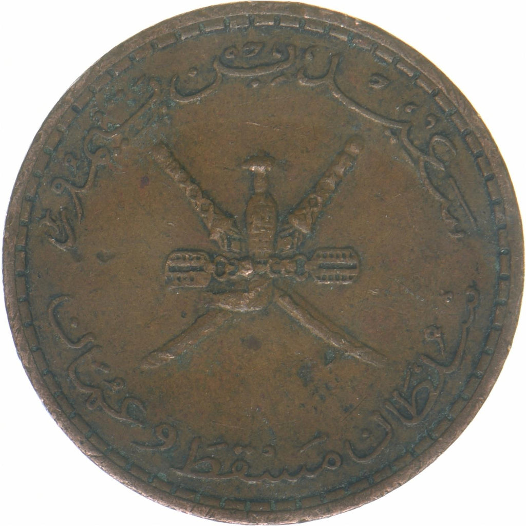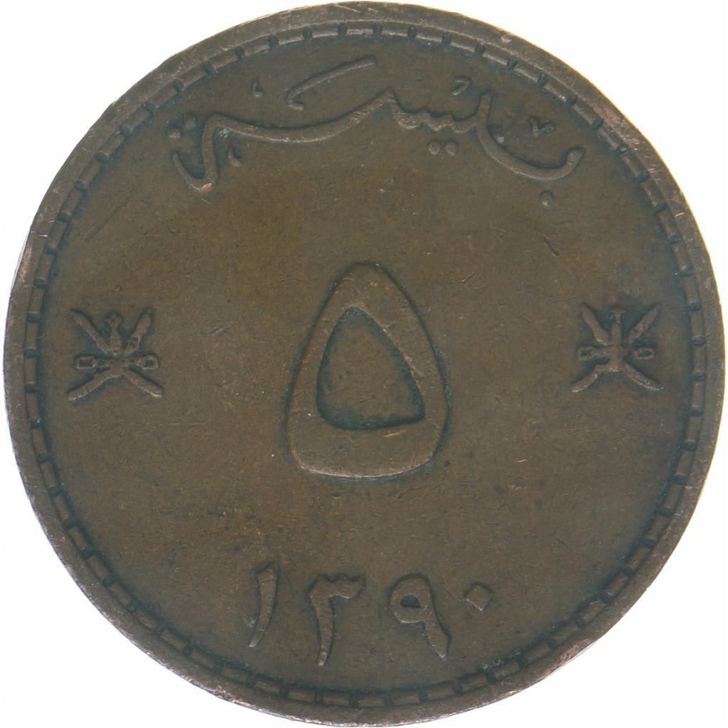 5 Baisa-mynt från Muscat och Oman (Sultanatet Muscat och Oman, سلطنة مسقط وعمان). Myntet cirkulerades 1970 och väljs slumpmässigt. Olika grader från Bra till Mycket fint. Ett foto är endast för reklamändamål. Myntet kan ha repor, smuts eller skador från oxidation.