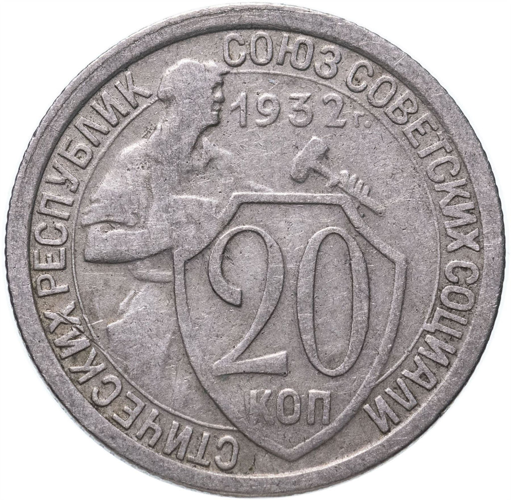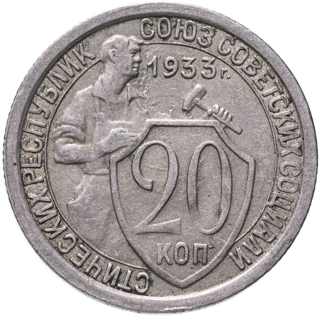 20 Kopecks mynt från Sovjetunionen (Unionen av sovjetiska socialistiska republiker, Союз Советских Социалистических Республик). Myntet cirkulerade 1931 - 1934 och väljs slumpmässigt. Olika grader från Bra till Mycket fint. Foto är endast för reklamändamål. Myntet kan ha repor, smuts eller skador från oxidation.
