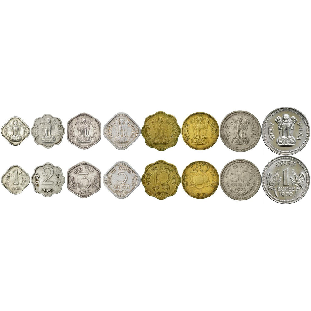 面额:1 Paisa,2 Paise,3 Paise,5 Paise,10 Paise,20 Paise,50 Paise,1 Rupee